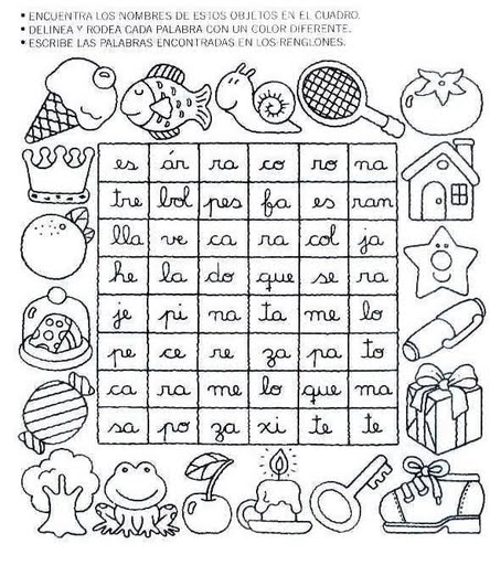 Encuentra los nombres de estos objetos en el cuadro. Delinea y rodea cada palabra con un color diferente. Escribe las palabras encontradas en los renglones.