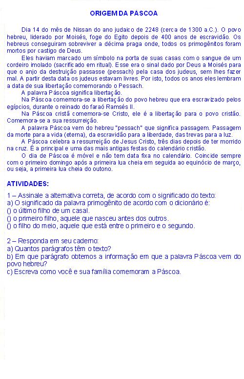 3º ano Atividades para a Páscoa: o verdadeiro sentido da Páscoa Sofia, 04.03.13 Como explicar a páscoa a crianças.O que é a pascoa,o que é a pascoa cristã. Tags:3º anoatividadeatividades prontas para impressãocomo explicar a páscoaensino religiosoo que é a pascoapáscoapáscoa ensinada a criançasreligiãoterceiro ano link do post comentar favorito Mais para ler